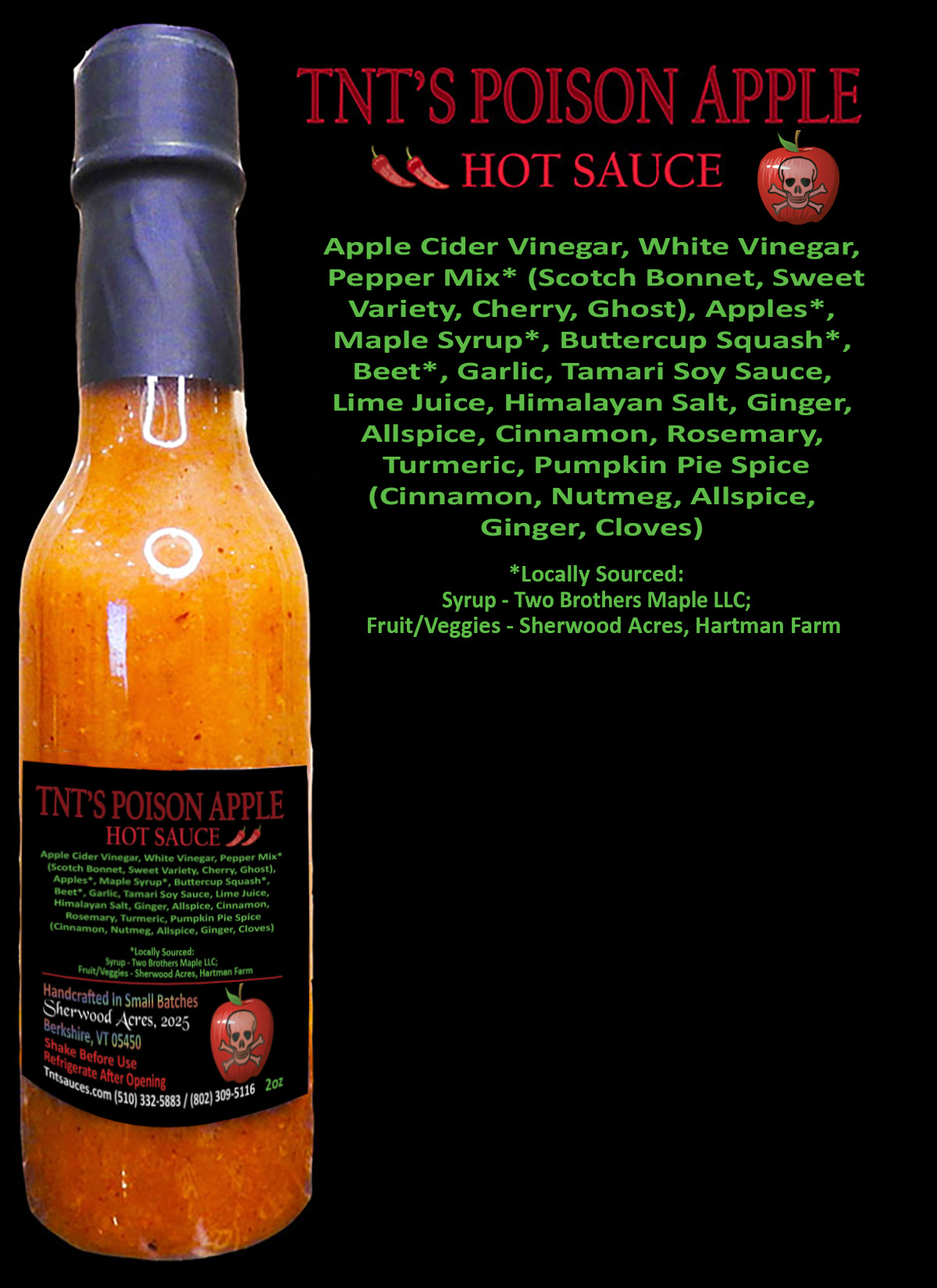 Plucked from wild apple trees in the back woods behind Sherwood Acres Gardens, this sauce captures the true essence of fall. We tend the trees, and in return, they share their luscious fruits. A dash of cinnamon, nutmeg, and ginger deepens the flavor, echoing the warmth of an apple pie kissed by sunshine. Scotch Bonnet, Ghost peppers, and hot cherry peppers add a fiery twist, while Vermont maple syrup lends a natural sweetness only Mother Nature could craft.