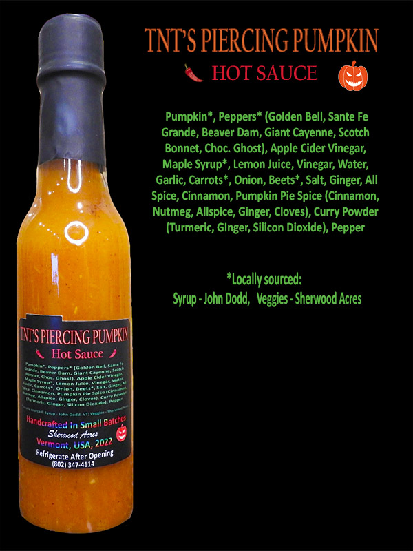 . Tyler smoked the pumpkins over apple & maple wood, and then we “topped the cake” with spicy peppers, from all across the Scoville spectrum: ghost, scotch bonnet, cayenne, beaver dam, and sante fe grande. There’s also a heavy dose of sweet in this tasty treat! You’ll think you’re getting a mouthful of hot pumpkin pie…and by “hot” we mean enough heat to keep you warm during the changing seasons.