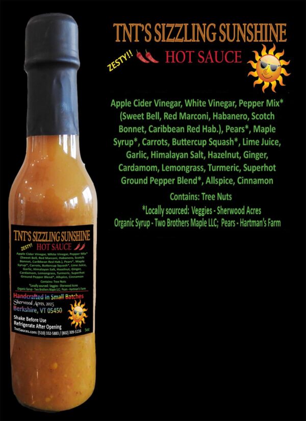 Mouth-watering sauce that ignites your taste buds. Savor the heat of sun-drenched hot peppers, including Trinidad scorpion, habanero, spicy banana, hot cherry, and scotch bonnet, along with the zesty kick of tomatillos, perfectly balanced with a touch of smokiness that lingers on your palate. Infused with garlic and onion, as well as, a hint of mustard, this is a dance of savory sensations, destined to elevate every dish to a whole new level of spicy perfection! Vermont honey rounds-off this super sweet seductive sauce.